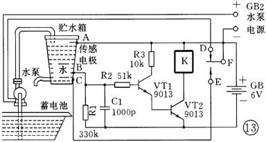 通常利用水塔向用户自来水龙头供水,而水塔则需要利用水泵向贮水箱不断补充水,水多了会溢出,少了供水又会中断,这就需要水位自动控制装置。 小水塔水位自动控制电路 见图13。它由水位传感电极、控制电路、电动机(小离心水泵用)和电源等组成。控制电路由VT1、VT2和继电器K等组成。当水箱缺水时,水面低于B点,水位传感电极A—B、B—C之间由于没有被水淹没而开路,VT1、VT2截止,继电器呈释放状态,继电器衔铁F与常闭触点D接触,接通水泵电源GB2,小离心水泵电动机启动,向贮水箱供水。当水位上升至A点,水位传感电极A—B之间被水淹没,产生偏置电流使得VT1、VT2导通,继电器吸合,常闭触点断开,小离心水泵停止供水。此时,继电器衔铁F与常开触点E相触,电源通过继电器接通的常开触点F-E以及C—B之间能微弱导电的水,继续产生维持VT1、VT2导通所需的偏置电流,继电器吸合。自控电路直到水位降至B点以下时,C—B之间开路,VT1、VT2截止,继电器释放,常闭触点接通,小离心水泵开始供水。如此周而复始,完成水位自动控制作用。